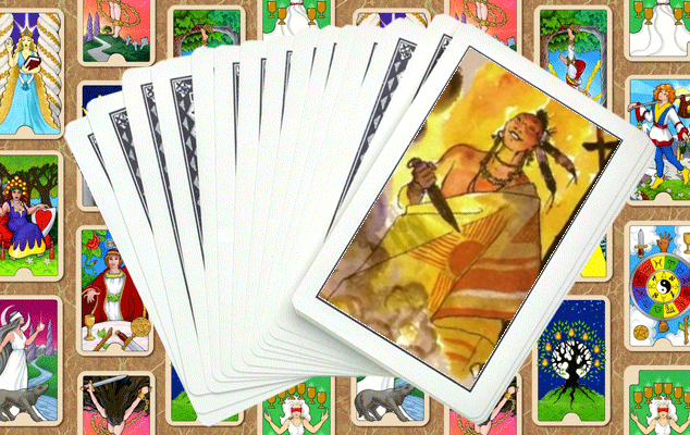 На карте мы видим мужчину, очень похожего на шамана, он это или нет, мы точно сказать не можем, но всё же, его одежда и его образ в целом говорят именно об этом. У него в руках ритуальный нож, который, по всей видимости, дополнительно придаёт ему силу, значимость и власть.